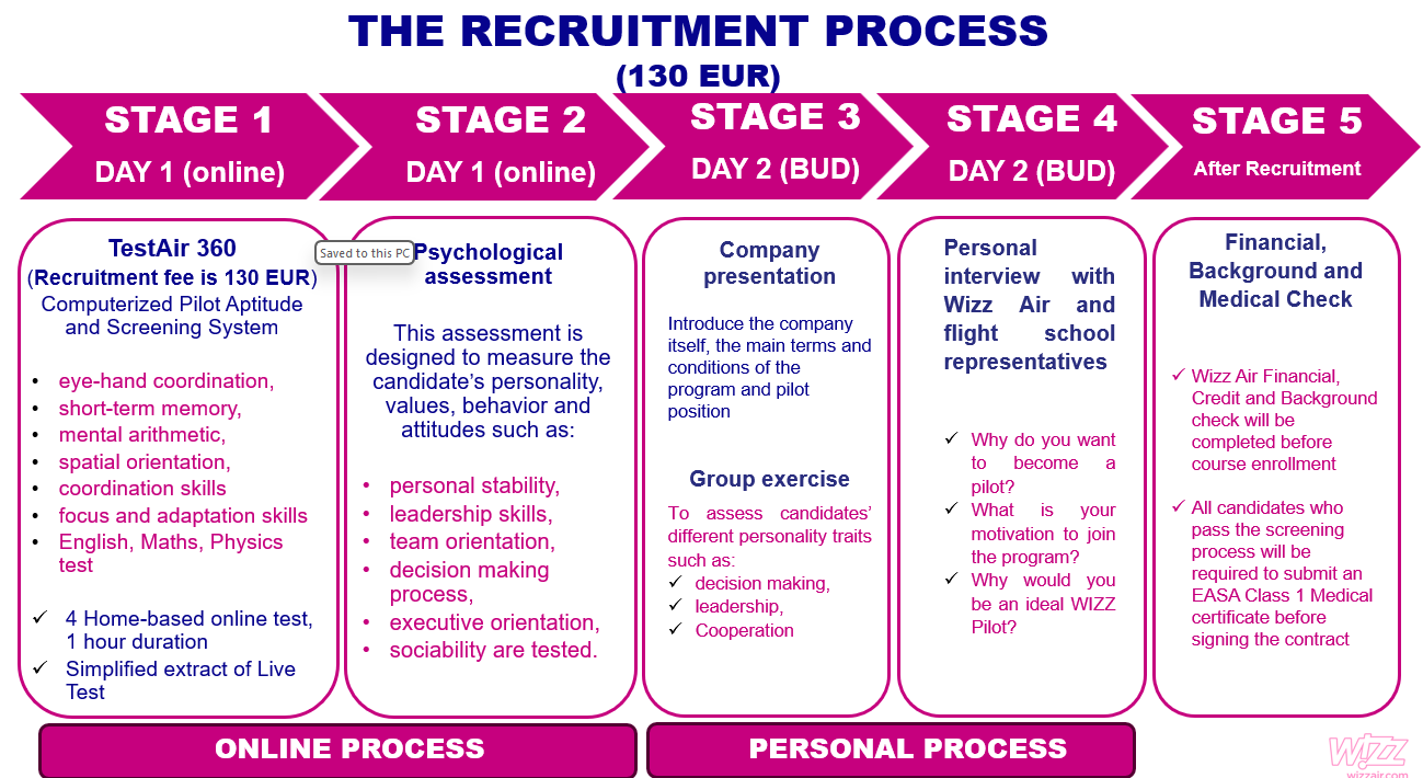 The first 2 stages of the recruitment is online (pilot aptitude test, psychological assessment), the other 2 stages of the process takes place in Budapest consisting of a group exercise, and in case the candidate passes this stage, can proceed to the personal interview as well on the same day.